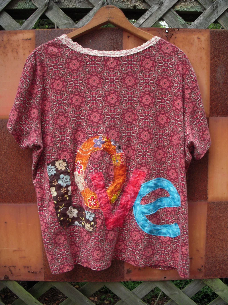 finally had a rainy day over the weekend, so i took the opportunity to work on some sewing projects. i feel compelled to write ‘love’ on everything lately, so i appliqued the word ‘love’ on the back itwas fun picking out the colors. i decided never mind about hemming the edges, just stitch the heck out of it and let the edges unravel over time. i just cut the neck hole how i wanted it, then stitched a long strip of peach calico onto the edge of the t-shirt. it will unravel slowly, too, adding charm (hopefully). anyway, people smile when they see it, and that’s good.