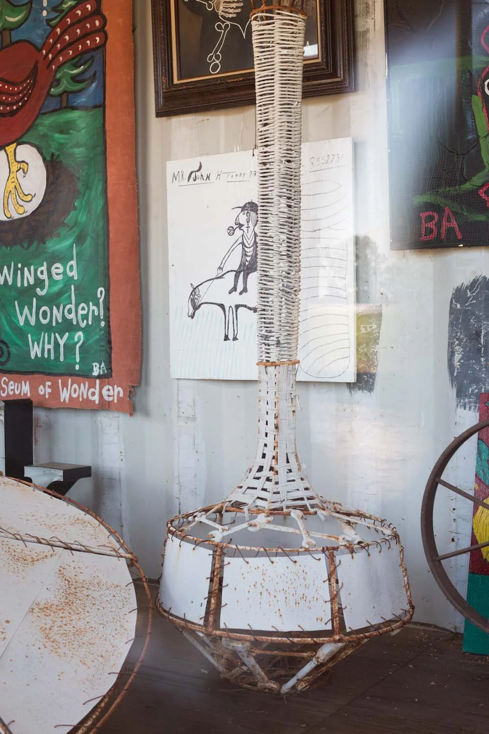 last week i found myself in southwest georgia for work. i enjoyed my original destination, but once i realized that i was only 20 minutes from seale, alabama, i knew that a detour was inevitable. luckily butch anthony was able to receive me as a visitor and i thank him for it. there was much to see and absorb in butch's world and i will share it on another day (a glimpse of part of his doo nanny can be found here). for now, enjoy this roadside attraction of his, his drive-thru stack of shipping containers filled with art and findings. if you are nearby, you should detour too.