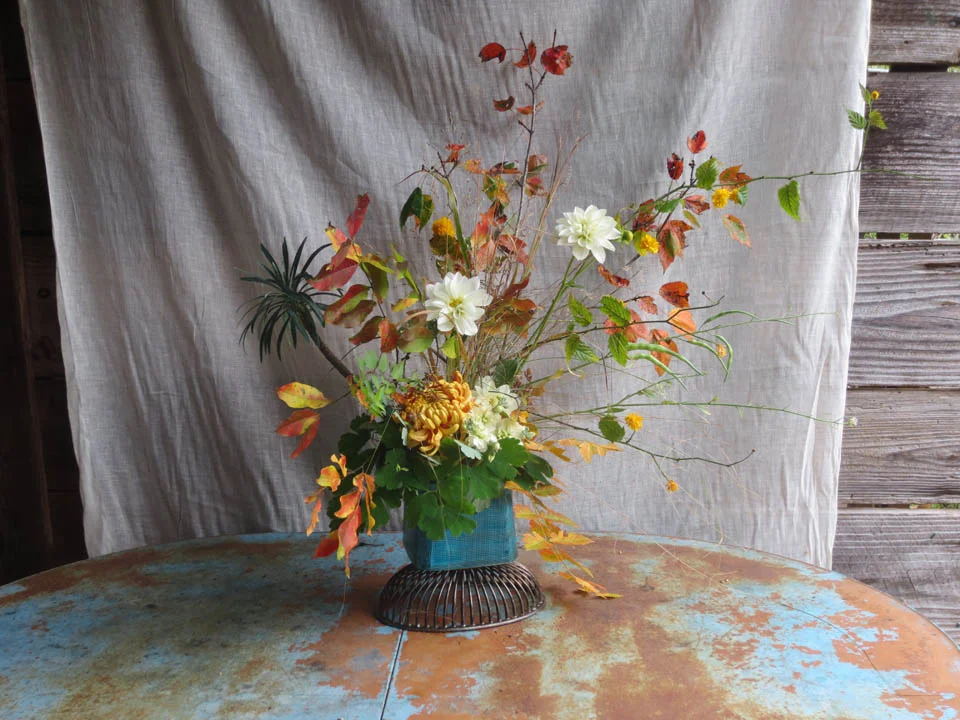 they had set up little work stations for each of us to do some flower arranging, on old bee boxes...buckets of flowers lined the greenhouse that we used as our work area, with more flowers spilling in from outside...